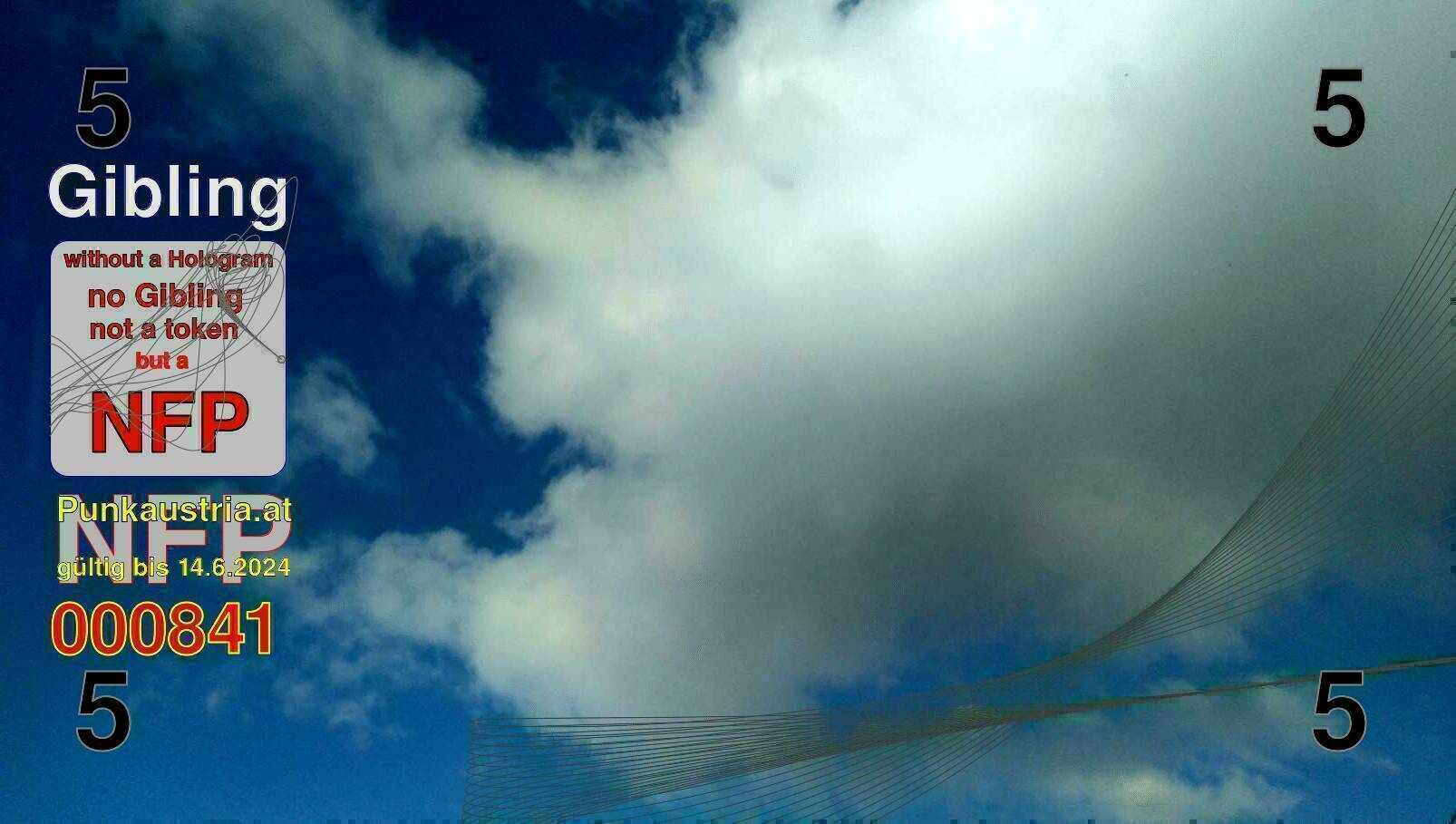 | Caption-Abstract | NFP stays for "Non Fungible Picture". The 11th Edition of our community currency Gibling is built on series of unique pictures. Each image file is unique by serial number and has a own a sha256 checksum. This data is stored in the metatags of the next picture of the series. In the metatags of the first image of the series you can find this text signed in our cryptocurrency Givecoin, created in 2014; NFPs is a fork of the Givecoin blockchain. With the NFPs we extend our ECO system in the context of process art. In this way, the Infolab of the Stadtwerkstatt wants to show another critical position on the logical truths in the new digital information society. The serial number of this image is 000841 and can also be found in the metatag "Original Transmission Reference". The checksum of the previous image is 3b82a71063912b07af4e4f5da55b896f2836a85e029496c72878d98bebae0269 and is also stored in the metatag: "Edit Status". Your bitcoinaddress: 1AUP2kTGu71vK6WpCesAzGQ8F9m4Kk8BZC. Your Givecoinaddress:Is printed on the back of the Gibling. To keep the process open, visit https://gibling.stwst.at and follow the instructions." |