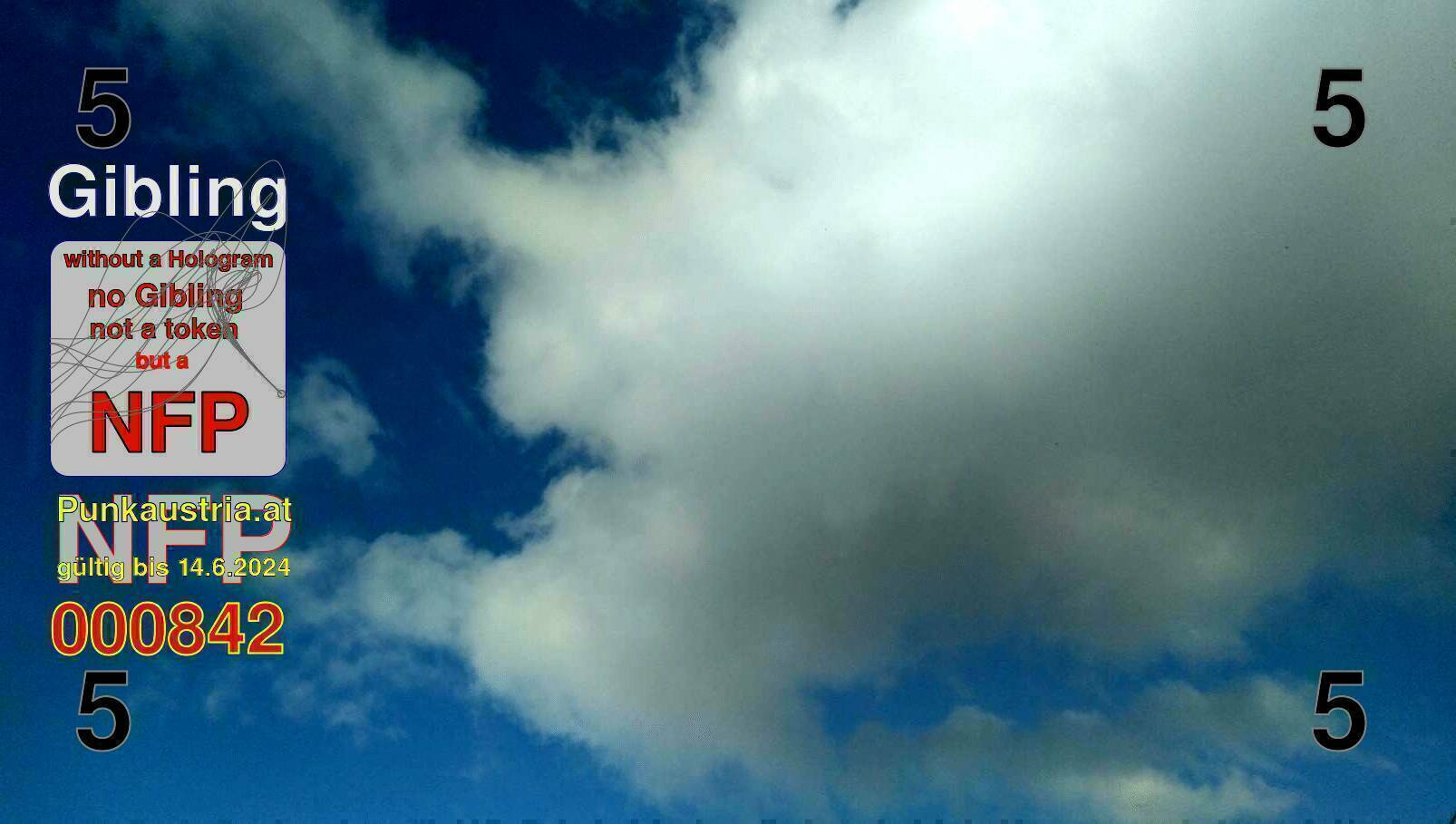 | Caption-Abstract | NFP stays for "Non Fungible Picture". The 11th Edition of our community currency Gibling is built on series of unique pictures. Each image file is unique by serial number and has a own a sha256 checksum. This data is stored in the metatags of the next picture of the series. In the metatags of the first image of the series you can find this text signed in our cryptocurrency Givecoin, created in 2014; NFPs is a fork of the Givecoin blockchain. With the NFPs we extend our ECO system in the context of process art. In this way, the Infolab of the Stadtwerkstatt wants to show another critical position on the logical truths in the new digital information society. The serial number of this image is 000842 and can also be found in the metatag "Original Transmission Reference". The checksum of the previous image is a3fecf8923eaa7ae0d54c0bda4688c1f5dbbe56049104c081078bc76111ae794 and is also stored in the metatag: "Edit Status". Your bitcoinaddress: 1AUPQc84JqwKeopNN6Jyhe8Sh2mTVq3p3r. Your Givecoinaddress:Is printed on the back of the Gibling. To keep the process open, visit https://gibling.stwst.at and follow the instructions." |