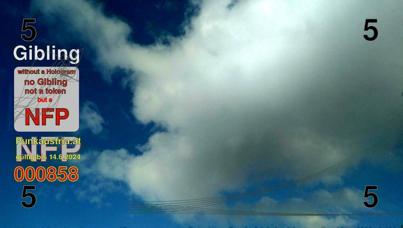 | Caption-Abstract | NFP stays for "Non Fungible Picture". The 11th Edition of our community currency Gibling is built on series of unique pictures. Each image file is unique by serial number and has a own a sha256 checksum. This data is stored in the metatags of the next picture of the series. In the metatags of the first image of the series you can find this text signed in our cryptocurrency Givecoin, created in 2014; NFPs is a fork of the Givecoin blockchain. With the NFPs we extend our ECO system in the context of process art. In this way, the Infolab of the Stadtwerkstatt wants to show another critical position on the logical truths in the new digital information society. The serial number of this image is 000858 and can also be found in the metatag "Original Transmission Reference". The checksum of the previous image is 3892e6f9f9a5af8012401e8b6fb31aeba1279e54f6b28bef44065bf78c6a33cf and is also stored in the metatag: "Edit Status". Your bitcoinaddress: 1AdKvXWnNb5LqHZ9qwRPFei7vbNjJ7BhzQ. Your Givecoinaddress:Is printed on the back of the Gibling. To keep the process open, visit https://gibling.stwst.at and follow the instructions." |