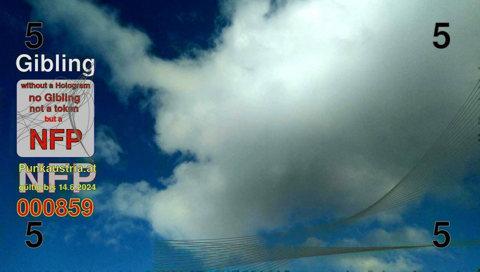 | Caption-Abstract | NFP stays for "Non Fungible Picture". The 11th Edition of our community currency Gibling is built on series of unique pictures. Each image file is unique by serial number and has a own a sha256 checksum. This data is stored in the metatags of the next picture of the series. In the metatags of the first image of the series you can find this text signed in our cryptocurrency Givecoin, created in 2014; NFPs is a fork of the Givecoin blockchain. With the NFPs we extend our ECO system in the context of process art. In this way, the Infolab of the Stadtwerkstatt wants to show another critical position on the logical truths in the new digital information society. The serial number of this image is 000859 and can also be found in the metatag "Original Transmission Reference". The checksum of the previous image is a833f64fbb1ecd199b2a19bb6ecc9f9df20ff4f244ad5f89e93187ab1ecb436f and is also stored in the metatag: "Edit Status". Your bitcoinaddress: 1AdSgoWWYVQRfJM2vY8dgnV7jbW2jfyxsA. Your Givecoinaddress:Is printed on the back of the Gibling. To keep the process open, visit https://gibling.stwst.at and follow the instructions." |
