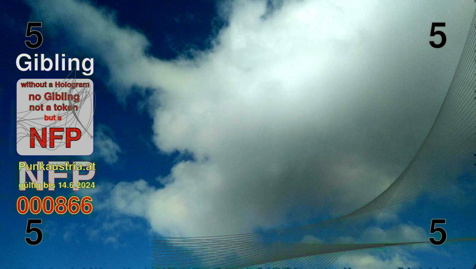| Caption-Abstract | NFP stays for "Non Fungible Picture". The 11th Edition of our community currency Gibling is built on series of unique pictures. Each image file is unique by serial number and has a own a sha256 checksum. This data is stored in the metatags of the next picture of the series. In the metatags of the first image of the series you can find this text signed in our cryptocurrency Givecoin, created in 2014; NFPs is a fork of the Givecoin blockchain. With the NFPs we extend our ECO system in the context of process art. In this way, the Infolab of the Stadtwerkstatt wants to show another critical position on the logical truths in the new digital information society. The serial number of this image is 000866 and can also be found in the metatag "Original Transmission Reference". The checksum of the previous image is 9ce3dbc4066cd3559d83290038c28d37fe8196299d214c82a5065a80b9cd0372 and is also stored in the metatag: "Edit Status". Your bitcoinaddress: 1Aj57yzniUKRNN3bRq92bZ7ja3uem6rALf. Your Givecoinaddress:Is printed on the back of the Gibling. To keep the process open, visit https://gibling.stwst.at and follow the instructions." |