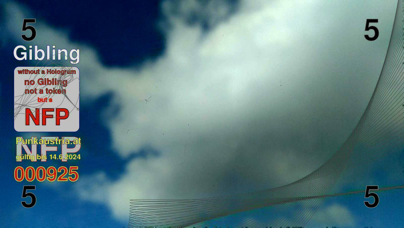 | Caption-Abstract | NFP stays for "Non Fungible Picture". The 11th Edition of our community currency Gibling is built on series of unique pictures. Each image file is unique by serial number and has a own a sha256 checksum. This data is stored in the metatags of the next picture of the series. In the metatags of the first image of the series you can find this text signed in our cryptocurrency Givecoin, created in 2014; NFPs is a fork of the Givecoin blockchain. With the NFPs we extend our ECO system in the context of process art. In this way, the Infolab of the Stadtwerkstatt wants to show another critical position on the logical truths in the new digital information society. The serial number of this image is 000925 and can also be found in the metatag "Original Transmission Reference". The checksum of the previous image is 6180f7ebb8a3fd69fc5712bbc42137501a008ca086b35979974aafbb395d96d9 and is also stored in the metatag: "Edit Status". Your bitcoinaddress: 1BKhFUmw6Bb3TwjkeQ6YTd5SLEXe2atvEV. Your Givecoinaddress:Is printed on the back of the Gibling. To keep the process open, visit https://gibling.stwst.at and follow the instructions." |