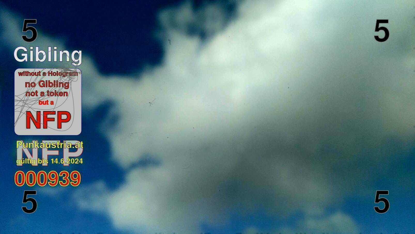| Caption-Abstract | NFP stays for "Non Fungible Picture". The 11th Edition of our community currency Gibling is built on series of unique pictures. Each image file is unique by serial number and has a own a sha256 checksum. This data is stored in the metatags of the next picture of the series. In the metatags of the first image of the series you can find this text signed in our cryptocurrency Givecoin, created in 2014; NFPs is a fork of the Givecoin blockchain. With the NFPs we extend our ECO system in the context of process art. In this way, the Infolab of the Stadtwerkstatt wants to show another critical position on the logical truths in the new digital information society. The serial number of this image is 000939 and can also be found in the metatag "Original Transmission Reference". The checksum of the previous image is 7b7e75c092522ed2e3344f08e382c8724853b0f68c711523979f64d52af6ce2d and is also stored in the metatag: "Edit Status". Your bitcoinaddress: 1BXZutbxQi812A89UvDLjNj5UW8QXYGaS7. Your Givecoinaddress:Is printed on the back of the Gibling. To keep the process open, visit https://gibling.stwst.at and follow the instructions." |