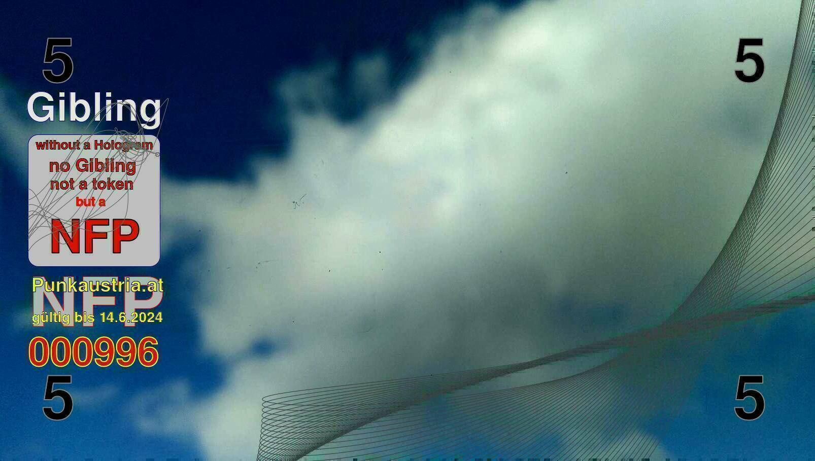 | Caption-Abstract | NFP stays for "Non Fungible Picture". The 11th Edition of our community currency Gibling is built on series of unique pictures. Each image file is unique by serial number and has a own a sha256 checksum. This data is stored in the metatags of the next picture of the series. In the metatags of the first image of the series you can find this text signed in our cryptocurrency Givecoin, created in 2014; NFPs is a fork of the Givecoin blockchain. With the NFPs we extend our ECO system in the context of process art. In this way, the Infolab of the Stadtwerkstatt wants to show another critical position on the logical truths in the new digital information society. The serial number of this image is 000996 and can also be found in the metatag "Original Transmission Reference". The checksum of the previous image is 5afe475f9708b32e90a280bf03a50e0a248275b9a77a3e1ae6e27b28d2062850 and is also stored in the metatag: "Edit Status". Your bitcoinaddress: 1CH6zuvzLZ49ssoKXQR3voJyAr6MLigtPJ. Your Givecoinaddress:Is printed on the back of the Gibling. To keep the process open, visit https://gibling.stwst.at and follow the instructions." |